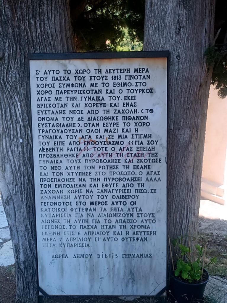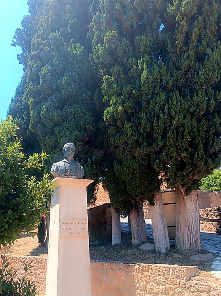 Στην είσοδο του θα συναντήσεις επτά ψηλά κυπαρίσσια και την προτομή οπλαρχηγού της επανάστασης από την περιοχή.