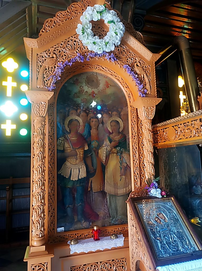 Εμείς δεν καταφέραμε να μπούμε στον ναό γιατί ήταν κλειστός. Να σου πώ ότι έχει τρεις Αγίες τράπεζες. Η μεσαία είναι αφιερωμένη στον Άγιο Γεώργιο, ενώ οι άλλες δύο στον Άγιο Κωνσταντίνο και Ελένη και στον Άγιο Δημήτριο.Απολαύσαμε όμως τη υπέροχη θέα προς το χωριό.