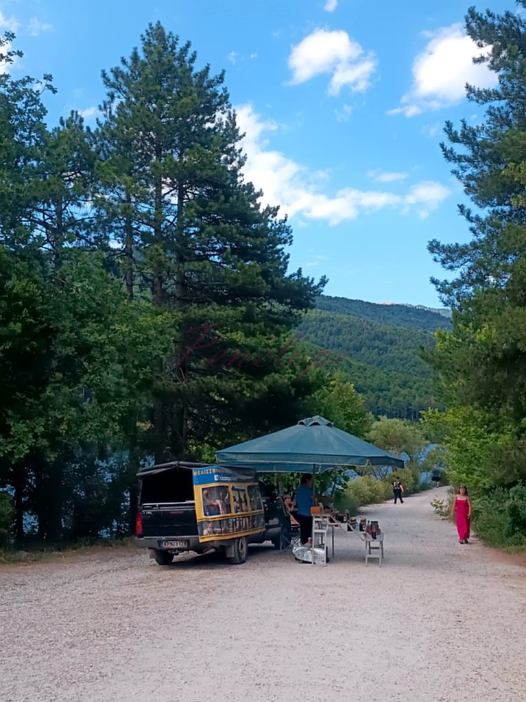 Δίπλα στην λίμνη θα βρεις μερικούς πλανόδιους πωλητές να πωλούν προϊόντα της περιοχής. Δοκιμάσαμε μέλι από ντόπιο μελισσοκόμο, κεραστήκαμε λικέρ μαστίχα και φύγαμε με μερικά βάζα φουντουκόμελου, ένα πολύ ξεχωριστό προϊόν που δεν έχουμε δοκιμάσει πουθενά αλλού στην Ελλάδα.