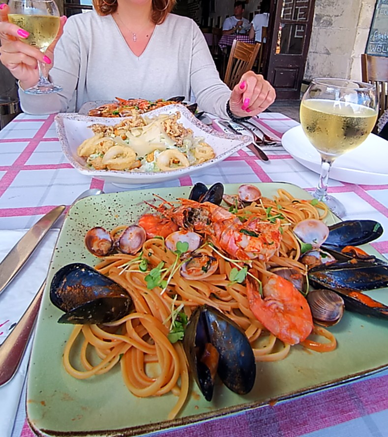 Όσες μέρες μείναμε εκεί ευχαριστηθήκαμε πιάτα θαλασσινών και καλό κρασί. Εστιατόρια δίπλα στην θάλασσα στο Marsaxlokk σερβίρουν πιάτα με ολόφρεσκα θαλασσινά. Εξίσου πεντανόστιμα πιάτα θα δοκιμάσεις και στα εστιατόρια του Αγίου Ιουλιανού ή στα μαγαζιά στα γραφικά δρομάκια της Βαλέτας ή της Μντινας.